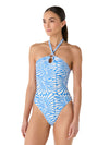 The Nadia Aqua One-Piece Swimsuit stands out for its halter design and a silhouette that enhances the figure with a fresh, modern feel. The central ring detail creates a sophisticated focal point, while the deep neckline elongates the torso. Its organic print adds visual movement, making it ideal for beach days with a relaxed yet elegant attitude.