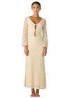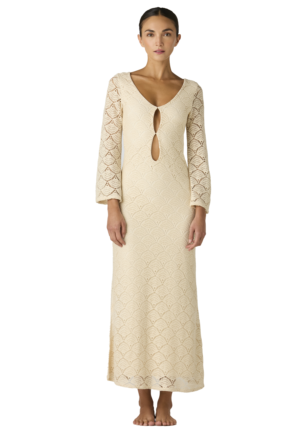 The Eden Caramel Dress is an elegant and sophisticated piece, ideal for beach and resort looks with a more polished feel. Its long silhouette and wide sleeves add fluidity, while the openwork fabric creates a subtle play of transparency that elevates the design.