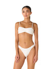 El Top de Bikini Sena Costera combina textura artesanal y estructura moderna. Confeccionado en un tejido bordado con relieve geométrico, ofrece soporte suave gracias a sus copas estructuradas y tiras de perlas ajustables. Su diseño sutil y femenino aporta una elegancia natural que trasciende lo clásico.