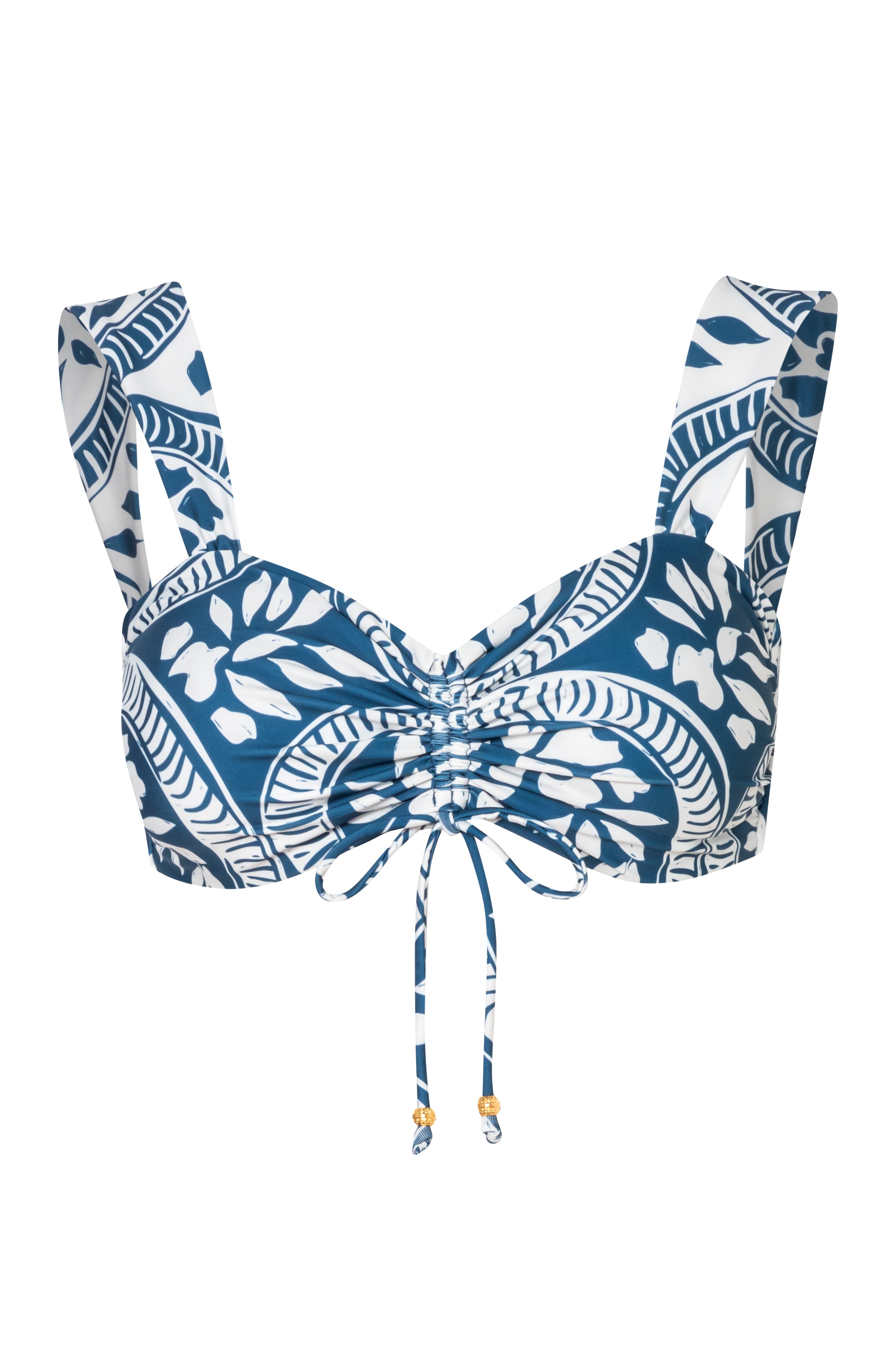 Top de vestido de baño tipo Bikini para mujer con un diseño único de un print azul con blanco perfecto para resaltar tu tono de piel. Este es un top ideal si lo que buscas es comodidad, cuenta con tiras gruesas lo que te brindará soporte y dos tiras que podrás amarrar a la espalda o al frente y estilizarlo como tu quieras.