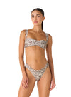 El Top de Bikini Kiva Sullu combina estructura y movimiento en un diseño contemporáneo. Confeccionado en tejido elástico con estampado animal en tonos tierra, presenta copas estructuradas que aportan soporte suave y tiras de perlas ajustables que enmarcan los hombros con un detalle artesanal. Una pieza que equilibra comodidad y sofisticación con sello Palmacea.