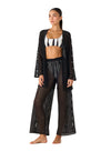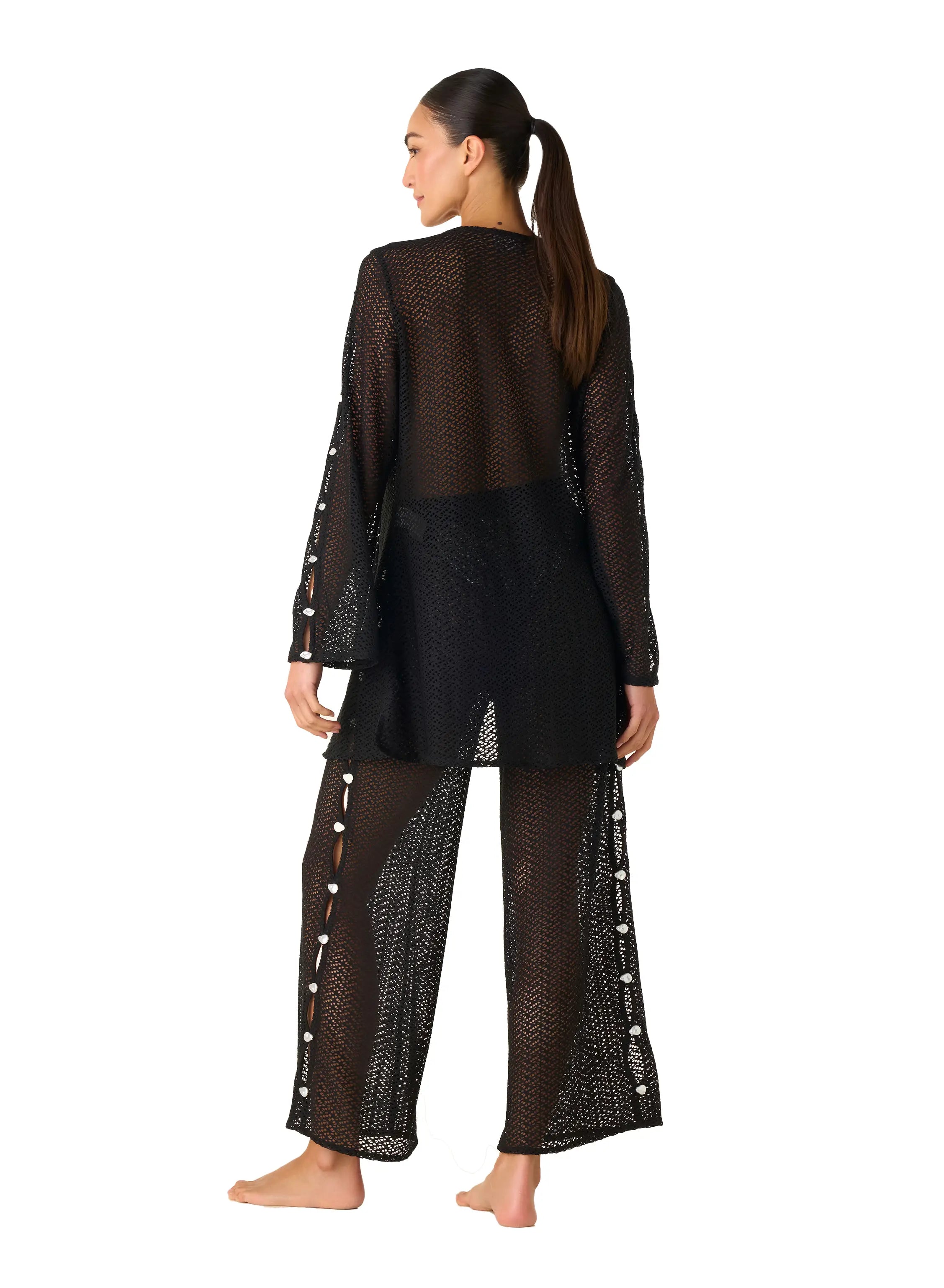 The Meli Zigzag Black Robe redefines lightness with elegance. Made from semi-sheer zigzag-textured fabric, it features a flowing silhouette that moves effortlessly with the body. Perfect to layer over swimwear or pair with the Yera Pants for a sophisticated, relaxed resort look.