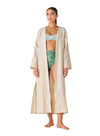 The Ude Praia Sand Robe drapes the body with lightness and sophistication. Crafted from naturally textured sand-tone fabric, it features a loose, flowing silhouette with long sleeves that move gracefully. A versatile piece that can be worn open over a bikini or closed for a more structured, relaxed look.