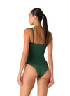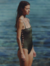 The Violeta Bambú One-Piece combines a sleek silhouette with refined detailing. Decorative pearls along the sides add an artisanal touch that contrasts beautifully with the minimalist design. Thin adjustable straps provide a comfortable, flattering fit, while the subtle sheen of the green fabric enhances its depth and sophistication.